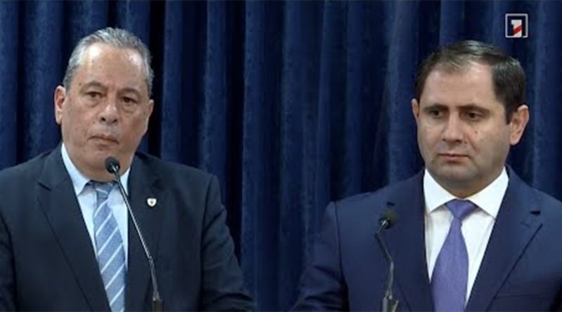 ՊՆ վարչական համալիրում ՀՀ պաշտպանության նախարար Սուրեն Պապիկյանը և Կիպրոսի պաշտպանության նախարար Վասիլիս Պալմասը հանդես են գալիս մամուլի համար համատեղ հայտարարությամբ: