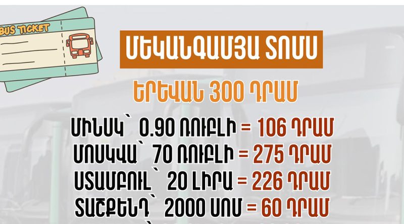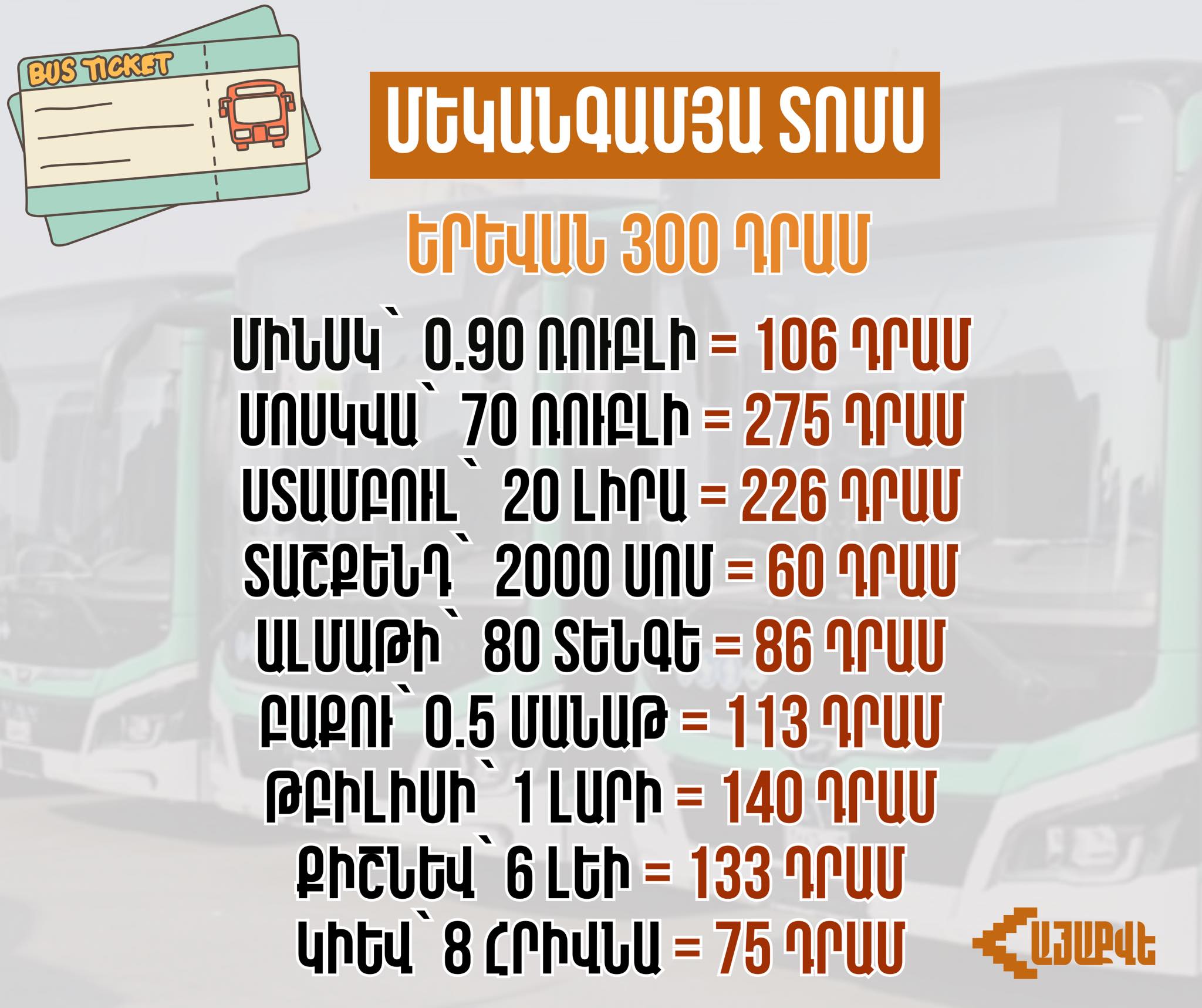 Այսպես, Երևանում մեկ անգամ տրանսպորտից օգտվելու գինը կդառնա 300 դրամ, մինչդեռ այլ երկրներում գներն ավելի ցածր են: