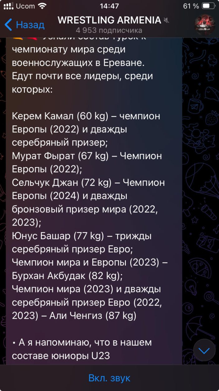 Նիկոլ հայադավի և իր ոհմակի այս նենգ նպատակին հասնելու և մերոնցից թուրք ըմբշամարտիկների պարտությունը գրեթե բացառելու, հակառակը՝ նրանց հաղթանակն ապահովելու նպատակով, «Պաշտպանության նախարարություն» կոչվածը Հայաստանի ԶՈւ բանակայինների հավաքականի կազմում սկզբնապես ընդգրկված մեր լավագույն (աշխարհի և Եվրոպայի առաջնություններում ոսկե և արծաթե մեդալներ նվաճած) ըմբշամարտիկներին, որոնք մինչև նոյեմբերի 15- ը (ներառյալ) մարզվել են ըմբշամարտի բանակայինների աշխարհի առաջնությանը մասնակցելու համար, հաջորդ օրը միջնորդավորված կերպով հայտնել է, որ նրանք չեն մասնակցելու առաջնությանը, նրանց փոխարեն հավաքականում ընդգրկվելու են բանակում ծառայող այլ ըմբշամարտիկներ: