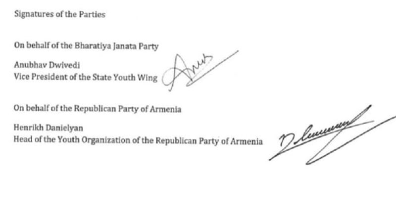 Հայաստանի Հանրապետական կուսակցության Երիտասարդական Կազմակերպության և Հնդկաստանի Բհարաթիա Ջանաթա կուսակցության երիտասարդական կազմակերպության միջև համագործակցության վերաբերյալ համաձայնագիր: