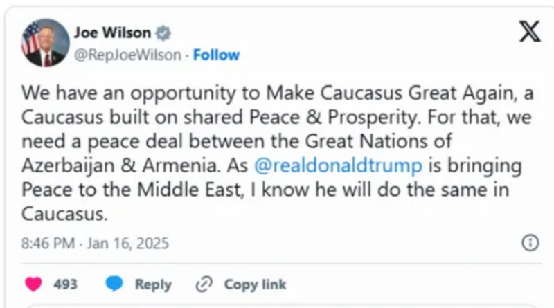 «Մենք հնարավորություն ունենք Կովկասը կրկին դարձնելու ուժեղ՝ հիմնված համընդհանուր խաղաղության և բարգավաճման վրա։ Դրա համար մեզ պետք է խաղաղության համաձայնագիր Ադրբեջանի և Հայաստանի ժողովուրդների միջև։ Ինչպես Դոնալդ Թրամփը խաղաղություն է բերում Մերձավոր Արևելքին, ես գիտեմ, որ նա նույնը կանի Կովկասում»,- X-ի իր միկրոբլոգում գրել է ԱՄՆ հանրապետական կոնգրեսականը: