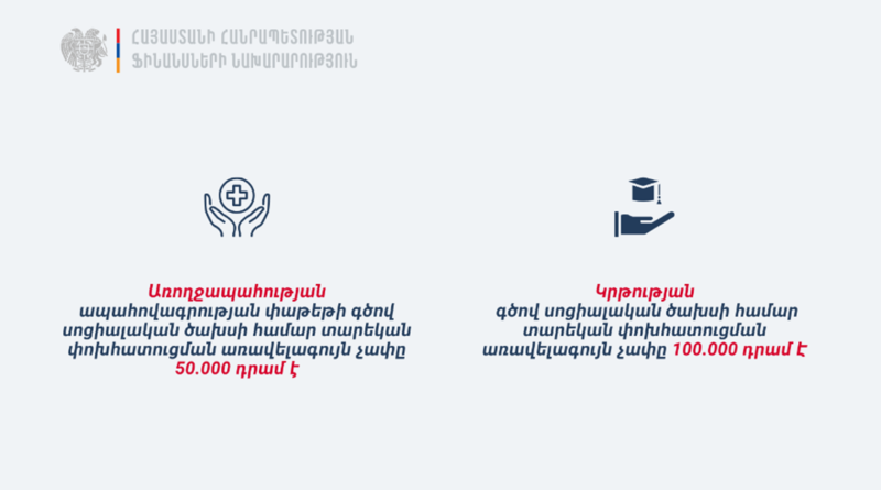 Ի լրումն վերոգրյալի՝ հավելենք, որ քաղաքացիների և վերջիններիս ընտանիքի անդամների համար նշված ուղղություններով կատարված սոցիալական ծախսերի առավելագույն չափը կազմում է տարեկան 100.000 դրամ, հայտնում են Ֆինանսների նախարարությունից։