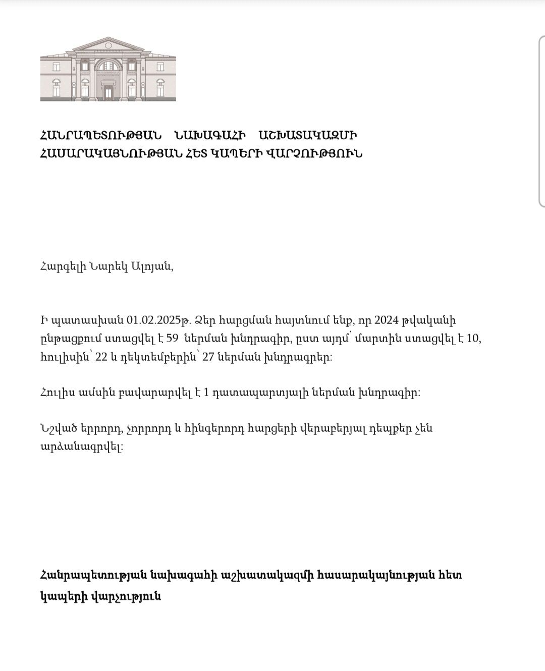 Այս թեմայով իմ ուսումնասիրությունները կլինեն շարունակական, իսկ 2024թ-ին բավարարված միակ խնդրագրի հրամանը կտեղադրեմ մեկնաբանություններում»,-նշել է նա։