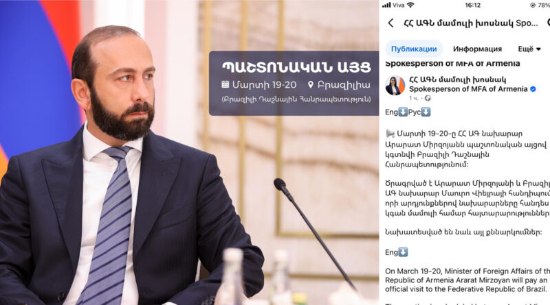«Մարտի 19-20-ը ՀՀ ԱԳ նախարար Արարատ Միրզոյանն պաշտոնական այցով կգտնվի Բրազիլի Դաշնային Հանրապետությունում: