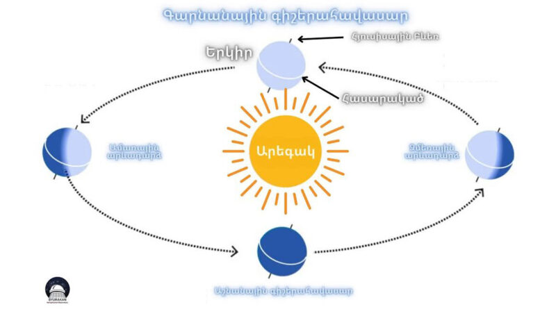 Մարտի 20-ին, Երևանի ժամանակով 13։01֊ին Արեգակը երկնքի հարավային կիսագնդից անցնում է հյուսիսային կիսագունդ, ինչն էլ աստղագիտական գարնան սկիզբն է: