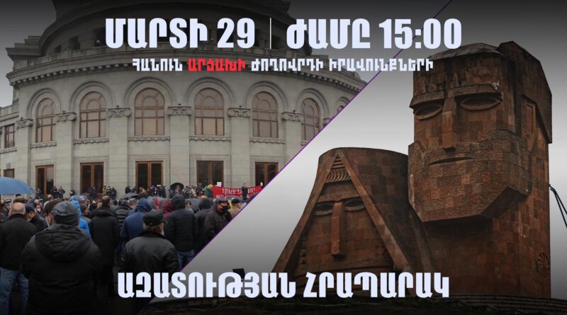 Մարտի 29-ին, ժամը 15:00-ին, Երևանի Ազատության հրապարակում տեղի կունենա մեծ հանրահավաք՝ հանուն արցախցիների իրավունքների պաշտպանության:Այս մասին հայտարարություն է տարածել Արցախցիների իրավունքների պաշտպանության խորհուրդը: