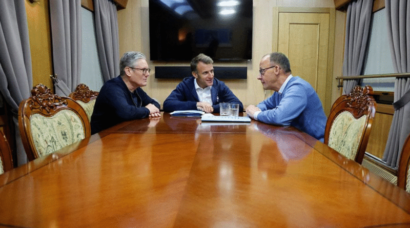 Գնացքի ճամփորդախցիկում Մակրոնի և Մերցի հետ է նաև Մեծ Բրիտանիայի վարչապետ Քիր Սթարմերը, որը ոչ մի կասկածելի բան չի անում, բայց կարծես այն նույն տղան է, որը մորը համոզում է, որ «մյուս տղաներն են ծխել, իսկ ինքը կողքին կանգնած է եղել»։