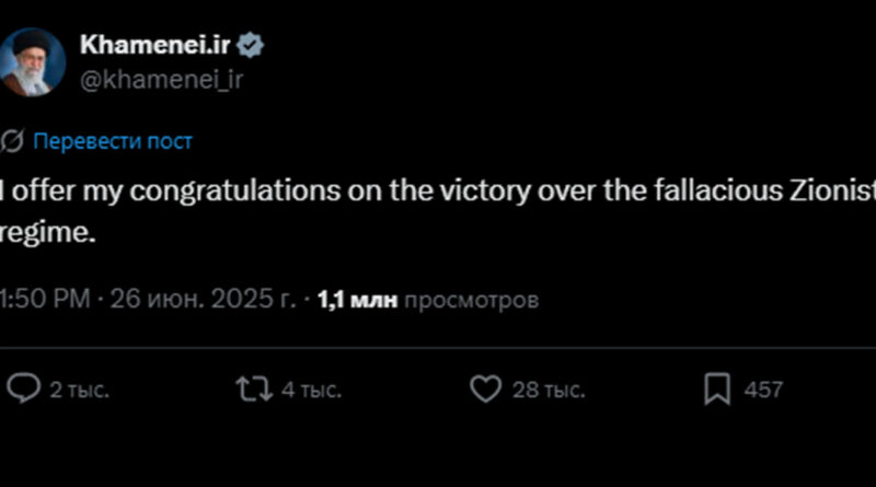 Իրանի գերագույն առաջնորդ Ալի Խամենեին շնորհավորել է ժողովրդին Իսրայելի նկատմամբ տարած «հաղթանակի» կապակցությամբ: Այս մասին ասվում է նրա X սոցիալական ցանցում արված գրառման մեջ։