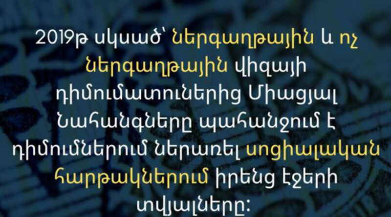 Նշվում է, որ 2019թ․ սկսած՝ ներգաղթային և ոչ ներգաղթային վիզայի դիմումատուներից Միացյալ Նահանգները պահանջում է դիմումներում ներառել սոցիալական հարթակներում իրենց էջերի տվյալները։