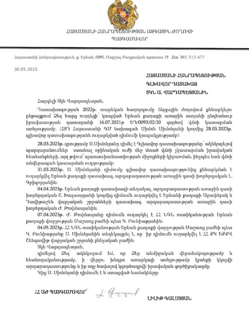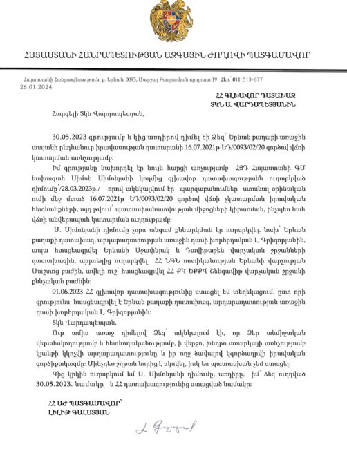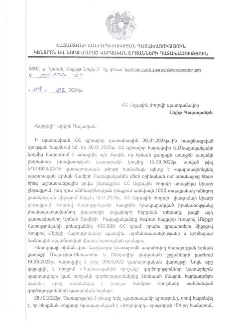 Անցնող չորս տարիներին երեք պաշտոնական նամակ եմ ուղղել Գլխավոր դատախազին, ամեն անգամ խորհրդարանում ներկայացվող տարեկան զեկույցների քննարկման ընթացքում հարց բարձրացրել, թե Գլխավոր դատախազությունն ինչ միջոցներ է ձեռք առնում՝ զրպարտողի նկատմամբ պատասխանատվության միջոցներ կիրառելու, ինչպես նաև վճռի անվերապահ կատարման ուղղությամբ: