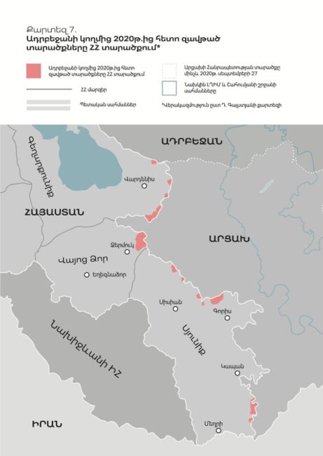 «Այս քարտեզում կարմիրով նշված են Հայաստանի Հանրապետության միջազգայնորեն ճանաչված այն տարածքները, որոնք 2021թ. հետո տարբեր ժամանակներում գրավվել են Ադրբեջանի զինված ուժերի կողմից։