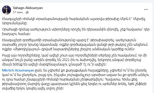 Դերասան Մկրտիչ Արզումանյանը ֆեյսբուքում շնորհակալություն է հայտնել ՔՊ-ական Վահագն Ալեքսանյանին, որ վերջինս իրեն աջակցող գրառում է արել իր պաշտոնական էջում։