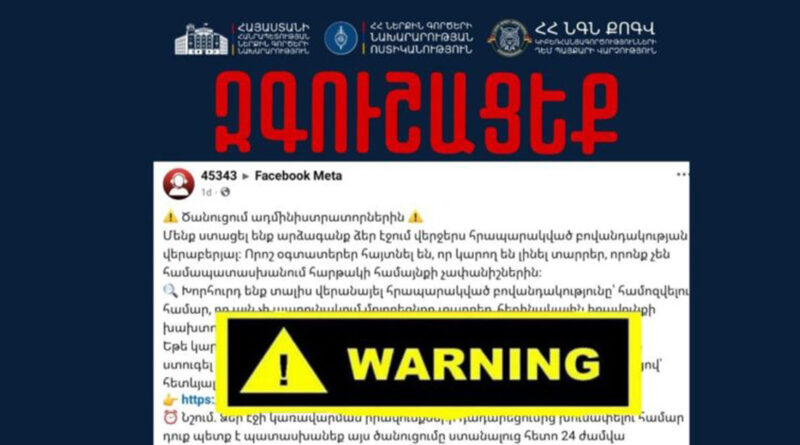 ՆԳՆ ոստիկանությունից հայտնում են․ «Եթե «Facebook» կամ «Instagram» սոցիալական ցանցերի ադմինիստրացիայի անունից ստացել եք ծանուցում ՝ Ձեր կողմից կայքի կանոնների խախտման, կամ Ձեր անհատական հաշվի վերաակտիվացման մասին, որով պահանջվում է ուղարկված հղումով տրամադրել Ձեր անհատական հաշվի մուտքանունն ու գաղտնաբառը՝ առաջացած խնդիրները լուծելու նպատակով, ՉՎՍՏԱՀԵՔ: