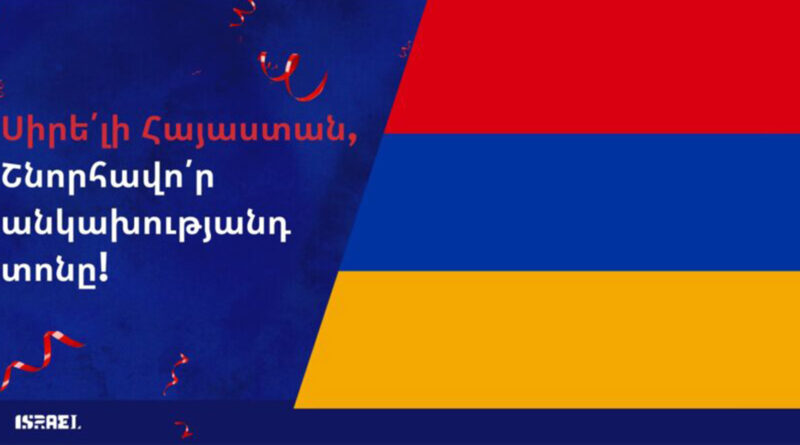 Պաշտոնական Իսրայելը շնորհավորել է Հայաստանին անկախության տոնի առթիվ 22.09.2025 0 min read Իսրայելի Արտաքին գործերի նախարարությունը X-ի էջում շնորհավորել է ՀՀ-ին․ «Սիրելի Հայաստան, շնորհավոր անկախությանդ տոնդ, հարգանքներով՝ Իսրայել»։