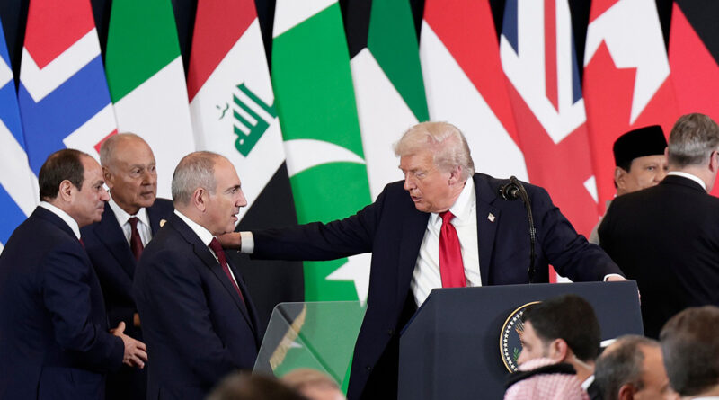 Թրամփը, որ այդ պահին շնորհակալություն էր հայտնում Գազայի հարցով Խաղաղության գագաթնաժողովի մասնակից երկրների ղեկավարներին, խոսքն ընդհատելով Փաշինյանին ասում է, որ մոտ գա, ապա շարունակում է ելույթը: