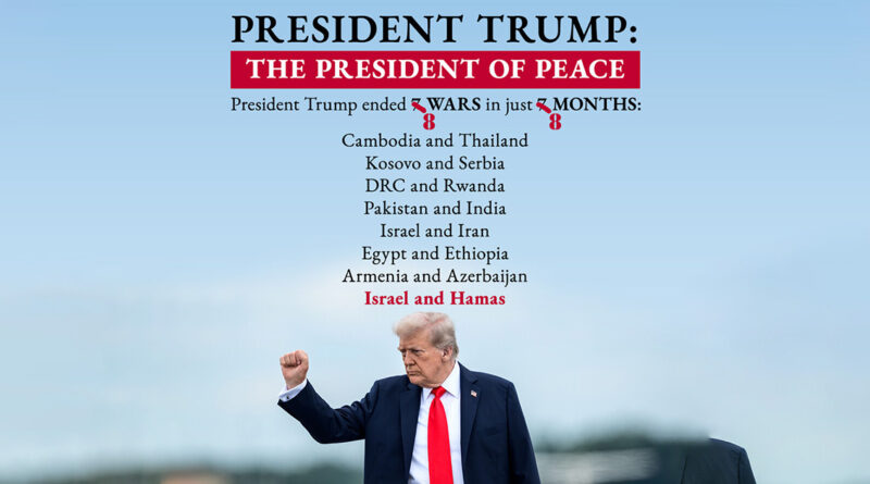 «Նախագահ Թրամփ։ Խաղաղության նախագահ։ Նախագահ Թրամփը 8 ամսում 8 պատերազմ է դադարեցրել։