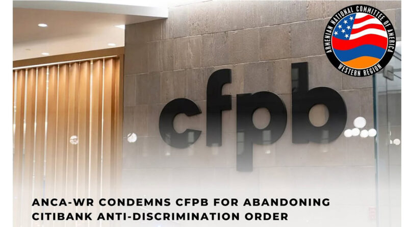 ԱՄՆ Հայ դատի հանձնախմբի Արևմտյան ափի գրասենյակը (ANCA-WR) խստորեն դատապարտում է Սպառողների ֆինանսական պաշտպանության բյուրոյի (CFPB) որոշումը, որը նախատեսում է ժամկետից երեք տարի շուտ դադարեցնել «Սիթիբանկի» նկատմամբ կիրառված հակախտրական վերահսկողական որոշումը՝ այն դեպքում, երբ բանկը մեղադրվում էր հայ-ամերիկացիների նկատմամբ խտրական վարկային քաղաքականություն իրականացնելու մեջ։