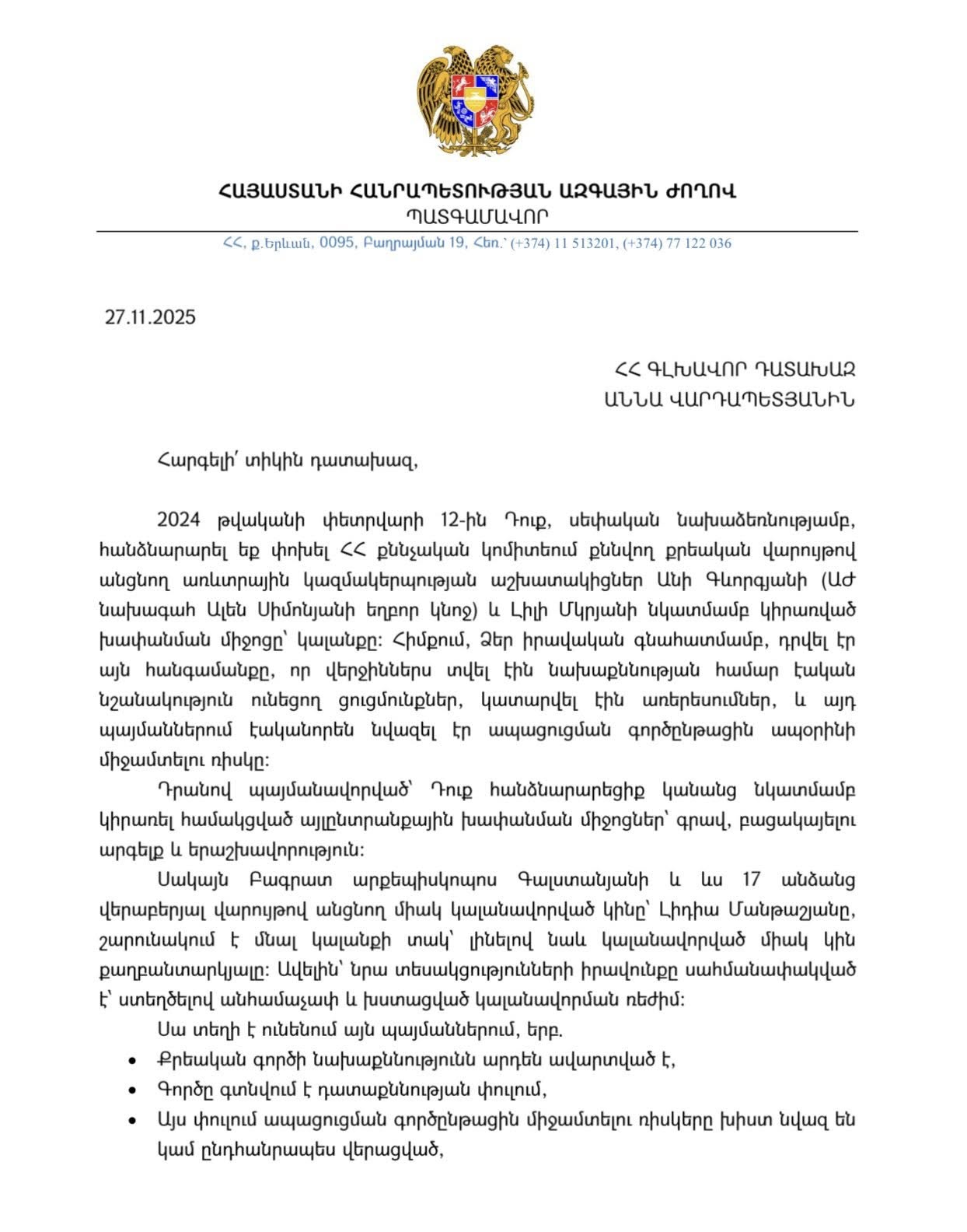 Հիշեցնեմ, որ դեռ 2024 թ․ փետրվարի 12-ին ՀՀ գլխավոր դատախազը սեփական նախաձեռնությամբ փոխեց Անի Գևորգյանի (ԱԺ նախագահ Ալեն Սիմոնյանի եղբոր կնոջ) ու Լիլի Մկրյանի նկատմամբ կիրառված կալանքը՝ հիմնավորելով, թե նրանք ցուցմունքներ են տվել, առերեսումներ են կատարվել և այլևս չկա միջամտության ռիսկ։