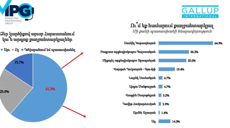 Մեկ այլ հարցի՝ «Ձեր կարծիքով այսօր Հայաստանում կա՞ն արդյոք քաղբանտարկյալներ։ Ու՞մ եք համարում քաղբանտարկյալ», պատասխանի մի քանի հնարավորություն ունենալով՝ քաղաքացիները տվել են հետևյալ անունները․