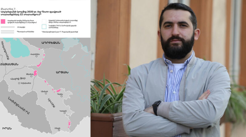 Քարտեզի վրա մանուշակագույնով նշված են այն տարածքները, որոնք Ադրբեջանը գրավել է Հայաստանի Հանրապետության ինքնիշխան տարածքից՝ առնվազն ավելի քան 300 քառակուսի կիլոմետր։ Այս մասին գրել է թյուրքագետ Վարուժան Գեղամյանը: