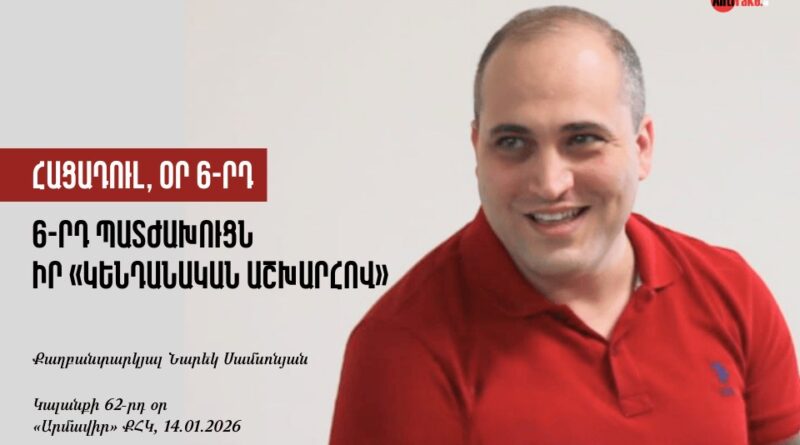 Ջերմ ողջույններ «Արմավիր» ՔԿՀ-ից: Ինչպես արդեն շատերդ տեղյակ եք, դատախազ Հայկ Ավետյանի և, ըստ մամուլի հրապարակումների, քրեական գործի սպառնալիքի տակ հայտնված դատավոր Մանվել Շահվերդյանի ուղիղ պատասխանատվությամբ ես ու ընկերս՝ Վազգեն Սաղաթելյանը, ակնհայտ ապօրինի կալանքի տակ ենք գտնվում և ես ամսի 9-ից գտնվում եմ անժամկետ հացադուլի մեջ։ Այսօր լրանում է հացադուլիս 6-րդ օրը, և քանի որ իմ պաշտպան Ռուբեն Մելիքյանը ևս անդրադարձել էր իմ ներկայիս 4 քմ-անոց խցի «կենդանական աշխարհին», որոշեցի մի քիչ պատմել 6-րդ պատժախցի մասին։