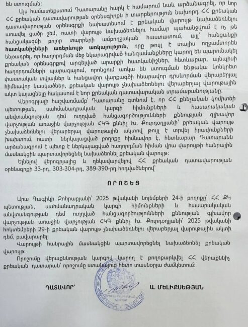 Դատարանը նշել է, որ «..առերևույթ առկա են ՀՀ քրեական օրենսգրքի 206-րդ հոդվածով նախատեսված հանցանքի հատկանիշները, ուստի քննիչը պարտավոր էր քրեական վարույթ նախաձեռնել և ստուգել հաղորդման մեջ նշված փաստերը»»: