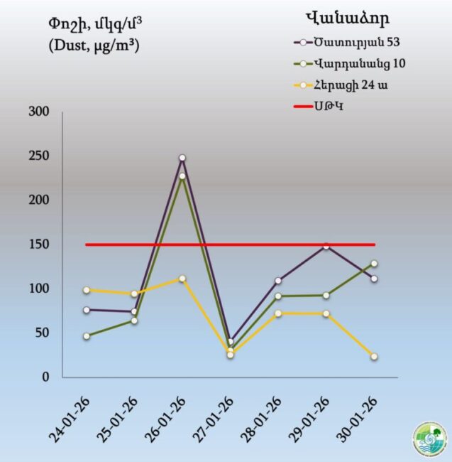 Քաղաքների մթնոլորտային օդում փոշու պարունակությունը հունվարի 24-30-ը (2026թ․)։ «Հիդրոօդերևութաբանության և մոնիթորինգի կենտրոն» ՊՈԱԿ-ից տեղեկանում ենք, որ մթնոլորտային օդում փոշու պարունակությունը ՀՀ չորս քաղաքներում գերազանցել է սահմանային թույլատրելի կոնցենտրացիան.