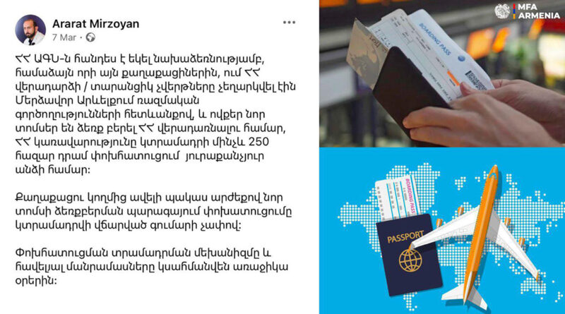 Ինչպես ավելի վաղ հայտնել էր ՀՀ ԱԳ նախարար Արարատ Միրզոյանը՝ ՀՀ ԱԳ նախարարությունը հանդես է եկել նախաձեռնությամբ, համաձայն որի այն քաղաքացիներին, ում ՀՀ վերադարձի ուղիղ կամ տարանցիկ չվերթները չեղարկվել էին պայմանավորված Մերձավոր Արևելքում ստեղծված իրավիճակով, և ում համար ավիաընկերությունը նոր տոմս չի ապահովել և իրենք են գնել ՀՀ վերադարձի նոր տոմսը, ՀՀ կառավարությունը կտրամադրի մինչև 250 հազար դրամ փոխհատուցում յուրաքանչյուր անձի համար։