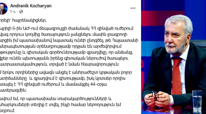 ՀՀ ԱԺ պաշտպանության և անվտանգության հարցերի հանձնաժողովի նախագահ Անդրանիկ Քոչարյանը գրում է «Ապրիլի 6-ին ԱԺ-ում ճեպազրույցի ժամանակ ՀՀ զինված ուժերում ավագ որդուս կողմից ծառայություն չանցնելու մասին լրագրողի հարցին իմ պատասխանով նպատակ ունեի ընդգծել, թե Հայաստանի Հանրապետության օրենսդրությամբ որքան են արժեվորվում կրթությունը և գիտական գործունեությամբ զբաղվելը, որ անձանց, ովքեր ունեն պետությանն իրենց գիտական ներուժով ծառայելու պատրաստակամություն, տրված է նման հնարավորություն։