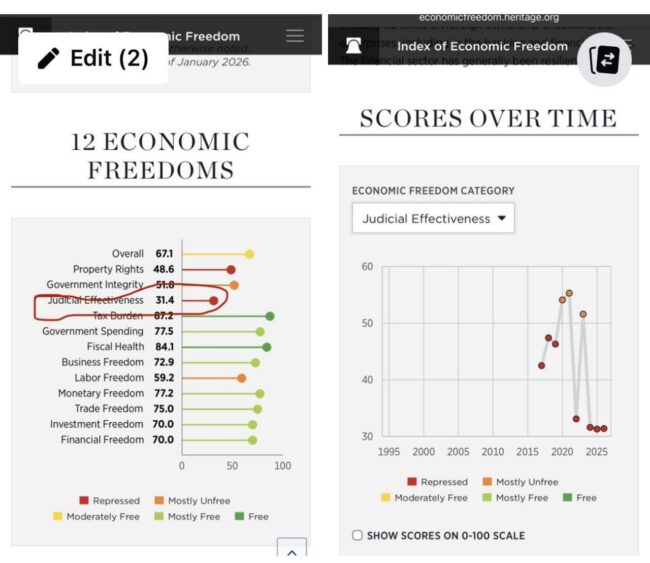 Այսպես, տնտեսական ազատությունները աշխարհում ուսումնասիրող HERITAGE հիմնադրամը, տնտեսական ազատությունների համաշխարհային իր վերջին զեկույցում՝ 2026 Index of Economic Freedom, Հայաստանի ցուցանիշների շարքում գնահատել է դատական էֆեկտիվությունը որպես ընկճված՝ repressed ցուցանիշ (սլայդ 1)։
