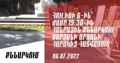 Ավելին«Դիմադրություն» շարժումը հուլիսի 6-ին՝ ժամը 19:30-ին, հանրային քննարկում կանցկացնի Սարյանի արձանի հարակից հատվածում։ Քննարկման թեման՝ «Սոցիալական խորացող ճգնաժամ. կեղծ խոստումներ,
