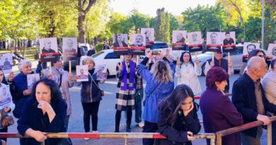 ԱվելինՍրբազան Պայքարի աջակիցները 18 Արդարների նկարներով պաստառներով և Ազատության պահանջով դատարանի դիմաց են: