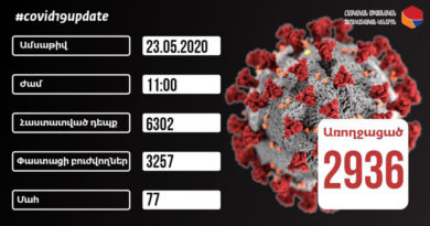 ԱվելինՄայիսի 23-ի, ժամը 11:00-ի դրությամբ հաստատվել է կորոնավիրուսային հիվանդության ընդհանուր 6302 դեպք, որոնցից 2936-ն` առողջացած, 77-ը` մահվան ելքով, տեղեկացնում է