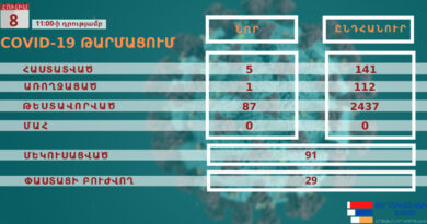 ԱվելինՀայաստանում հուլիսի 8-ի դրությամբ հաստատվել է կորոնավիրուսով վարակման 535 նոր դեպք, վարակվածների ընդհանուր թիվը հասել է 29820-ի: Ինչպես տեղեկացնում է
